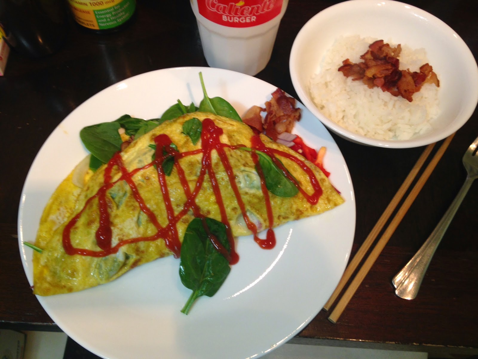egg/3 egg whites omelet with bacon, spinach, peppers, and other veggies. A bowl